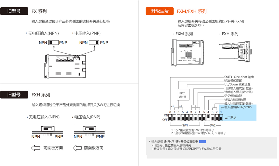 FXM / FXH系列数字计数/计时器集成了计数器和计时器的功能。 计数速度有1 cps,30 cps,2 kcps和5 kcps可用,并且计时器模式下有多种时间设置范围。 加计数,减计数和加/减模式可用于精确测量和显示各种系统配置。 用户可以使用附带的DIP开关轻松切换NPN / PNP输入。 FXM / FXH系列有2个标准DIN尺寸(W 72 x H 72,W 48 x H 96 mm)的4位,6位和8位显示型号。